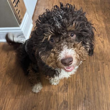 Clyde is our only stud at the moment. He is a F1 Mini Bernedoodle. He is the most loving relaxed guy around. He loves attention and to be with his people, he loves to carry his stuffed toys around and play outside!